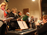 Pfarrerin Heike Schuffenhauer, die selbst im Posaunenchor mitspielt, lobte das große Engagement des musikalischen Leitungsteams sowie auch Sabine Göb, die liebevoll Kuchen, Muffins und Plätzchen in Notenschlüsselform gebacken und ein deftiges Chili con Carne zur Stärkung nach der Probe vorbereitet hatte. Heike Schuffenhauer freute sich außerdem, als Ehrengast Propst Oliver Albrecht begrüßen zu können, der auf der Trompete mitwirkte. Da angesichts des bevorstehenden Nikolaustages auch der Bischof Nikolaus dem Konzert einen Besuch abstattete und für eine schöne Bescherung sorgte, kam es zu einer Begegnung zweier Bischöfe an diesem Abend!