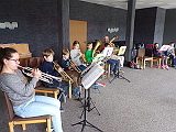 Nach der Ankunft bezogen wir unsere Zimmer und um 18.30 Uhr trafen sich die 16 Teilnehmenden im Alter zwischen 8 und 13 Jahren zum Abendessen. Danach wurden die jungen Bläserinnen und Bläser in drei Gruppen eingeteilt.
