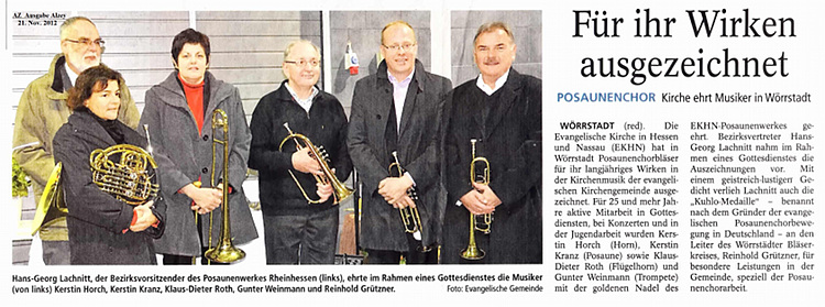 Der Vorsitzende des Posaunenwerks der EKHN, Bezirk Rheinhessen ehrte in einem Erntedank-Festgottesdienst Posaunenchor und Jubilare (siehe Presse-Mitteilung mit Bildern)